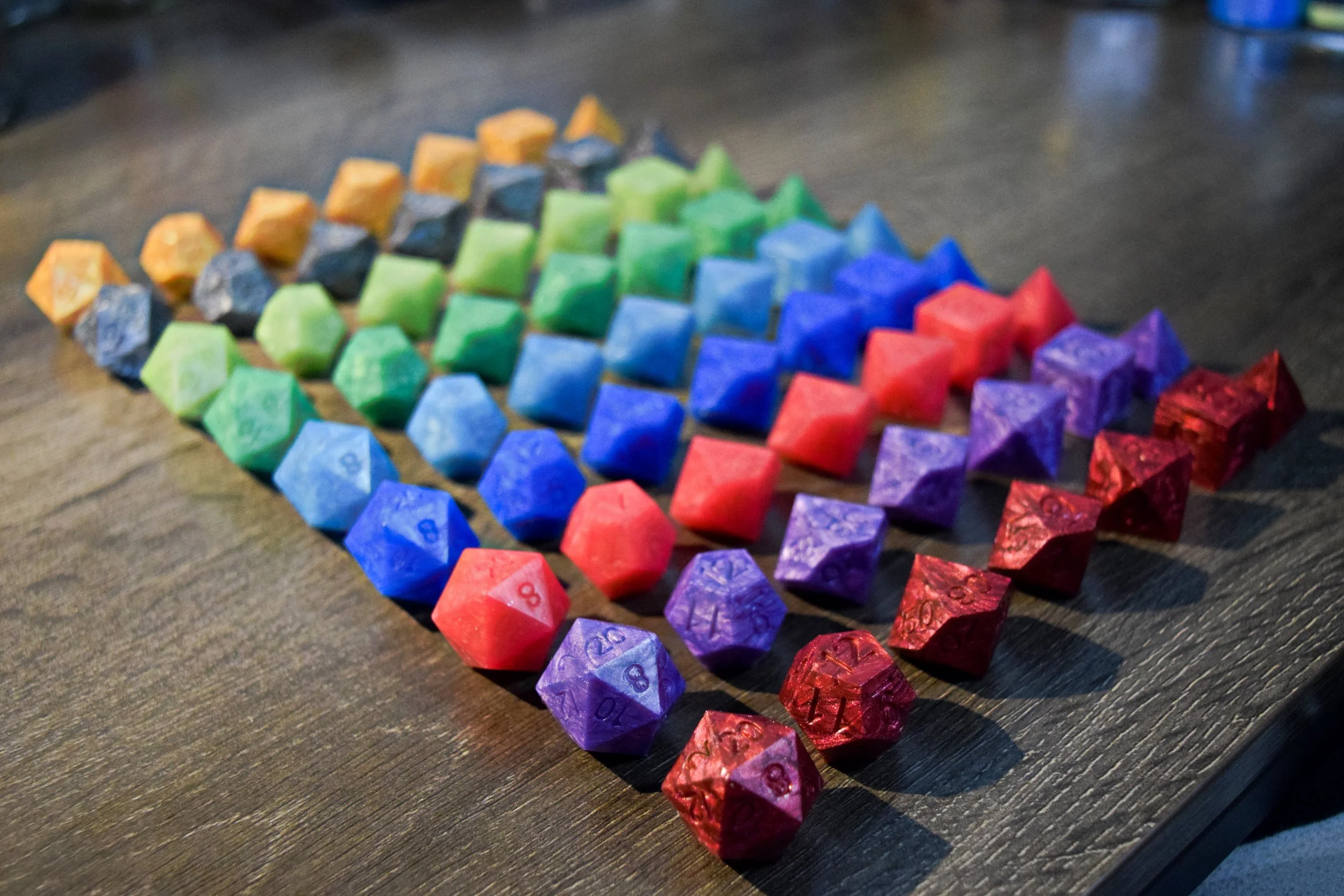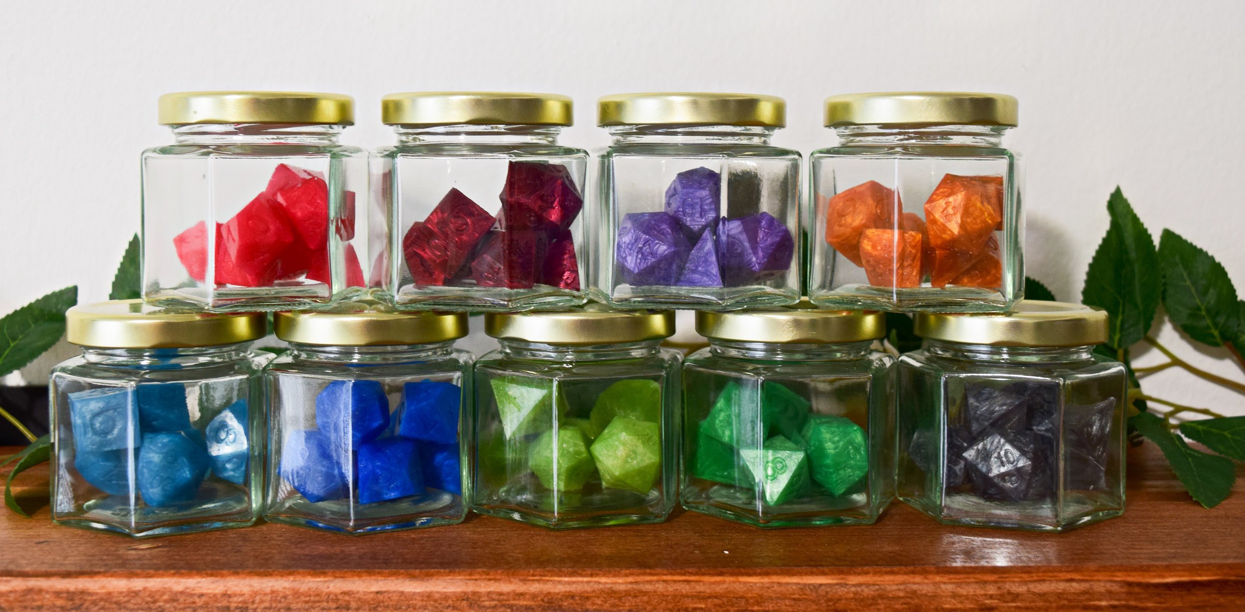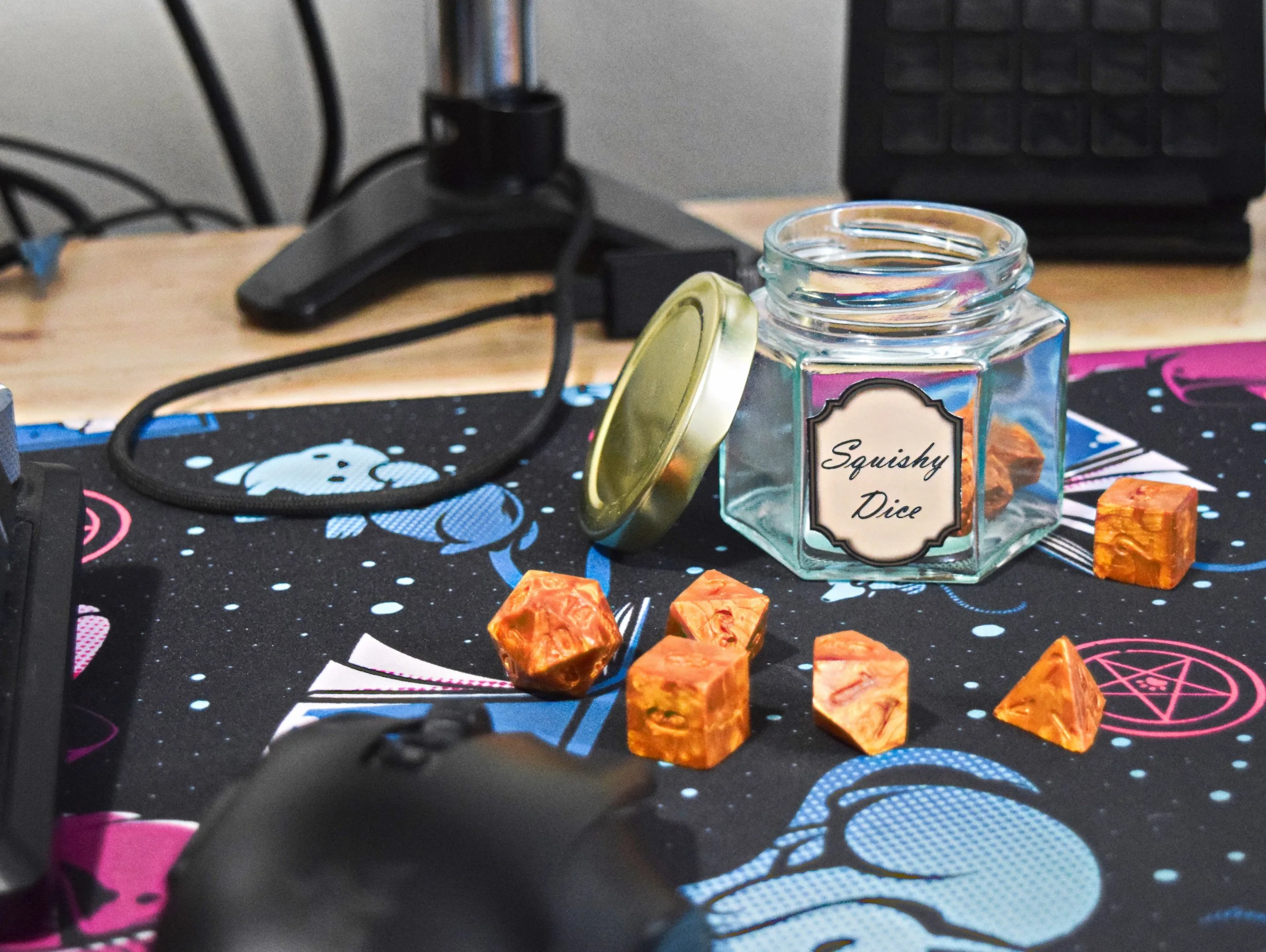 As a fellow dice goblin, I have always had a weakness for dice. Although one thing I never found for years was squishy dice, so I decided to make my own! In recent years, the big dice dealers have come up with their own “squishy dice.” The ones I make are a level up! All the dice I sell are hand-made by me and not outsourced by another. Everything from mixing the chemicals to cleaning the molds to trimming each individual die themself.