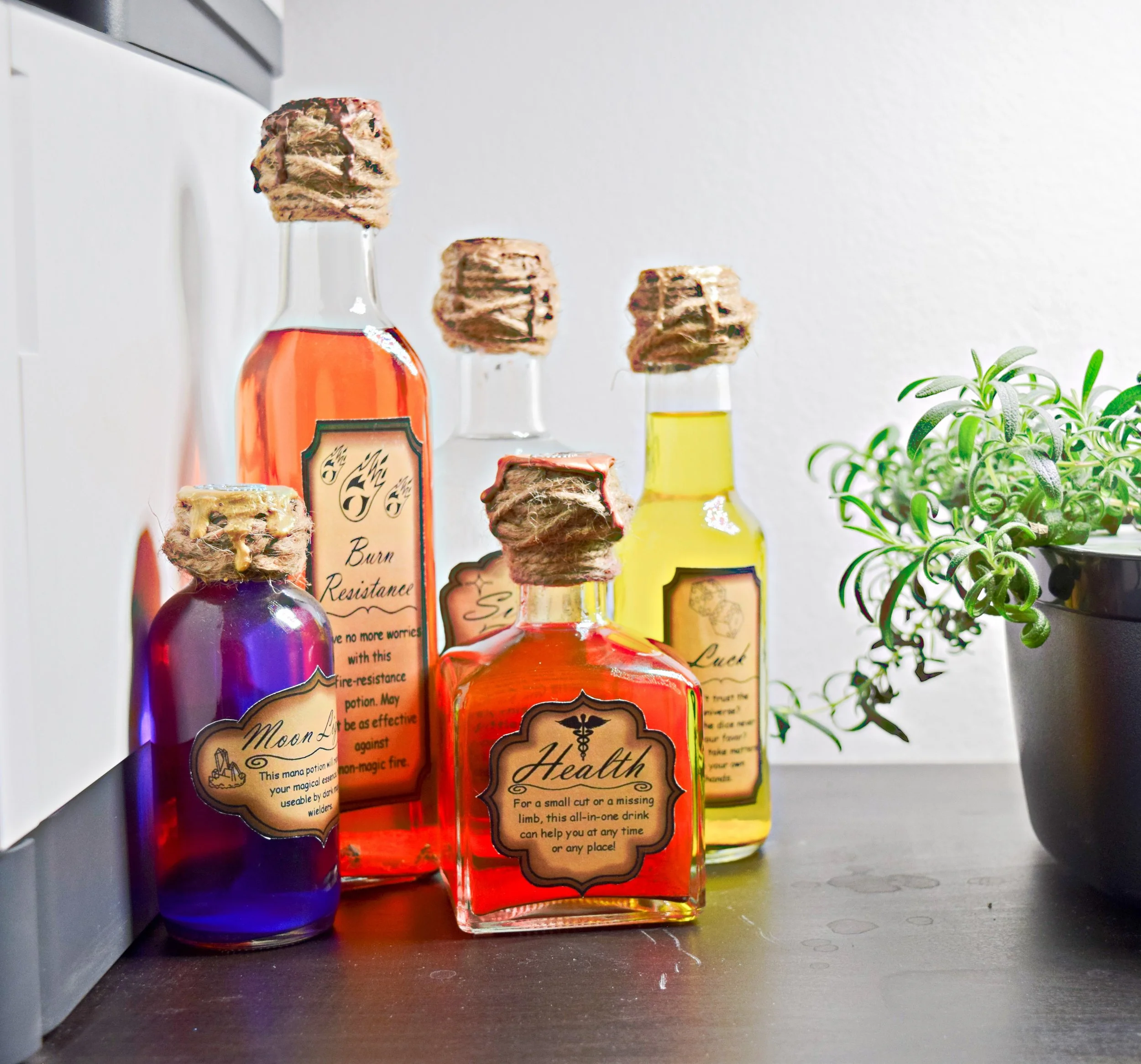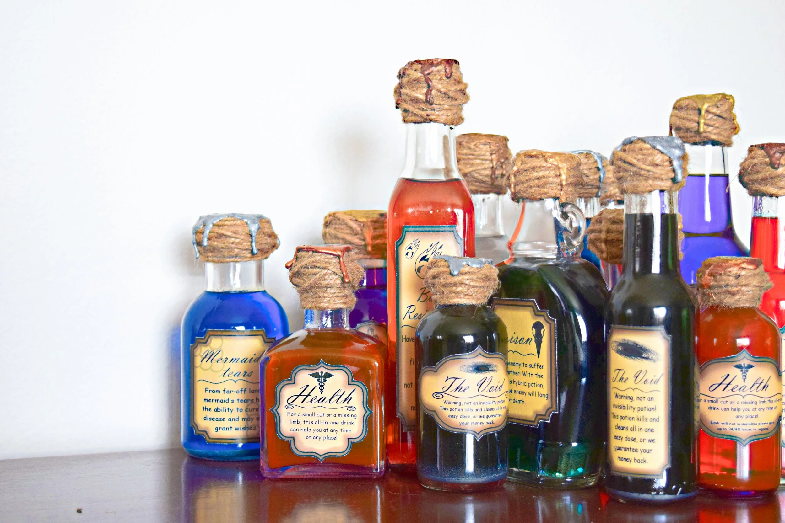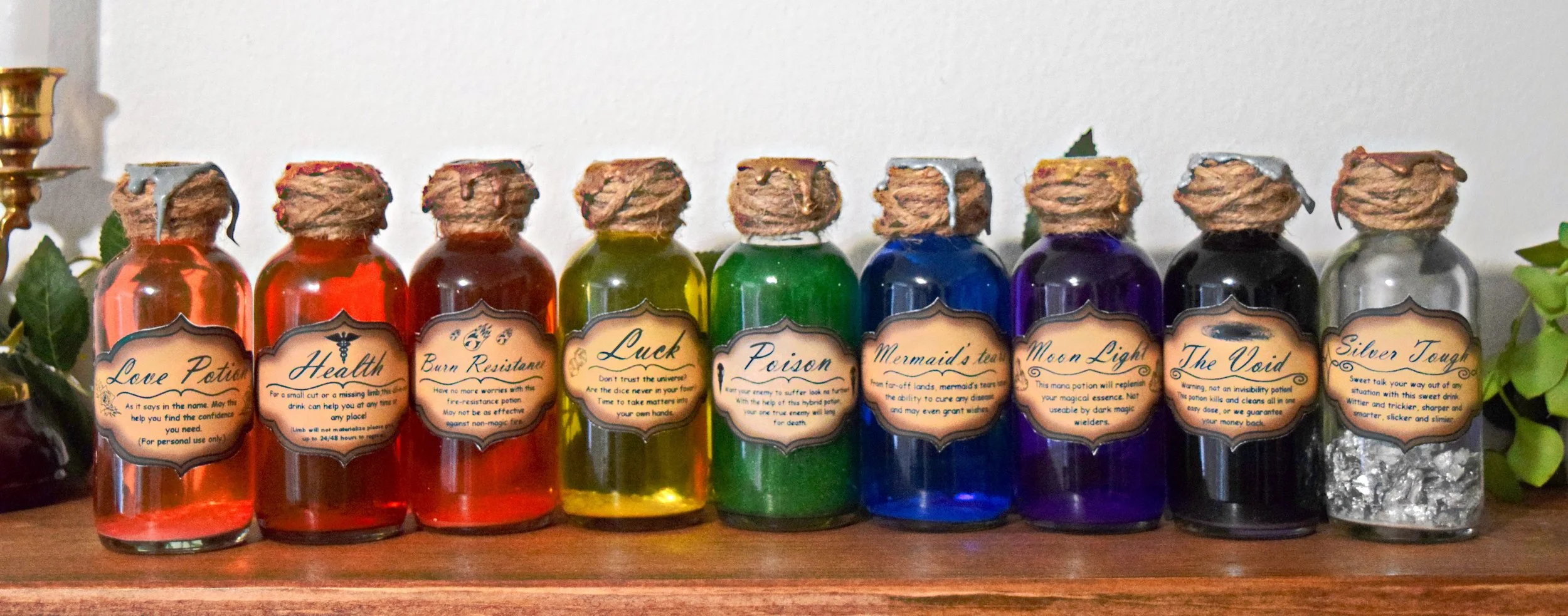 My potion bottles started as small little 4oz bottles that I sold at my first-ever convention I worked. I have gone from only having four colors with hand-drawn labels to offering so much more! I am proud to say I have nine different colors in all sorts of fun shapes for the bottles. Furthermore, the labels are all original art and text, with no copyright. I have hand-drawn the labels and all the art on them. My potion bottles are great as decor, but they are also designed and reinforced so they can be picked up and shaken!